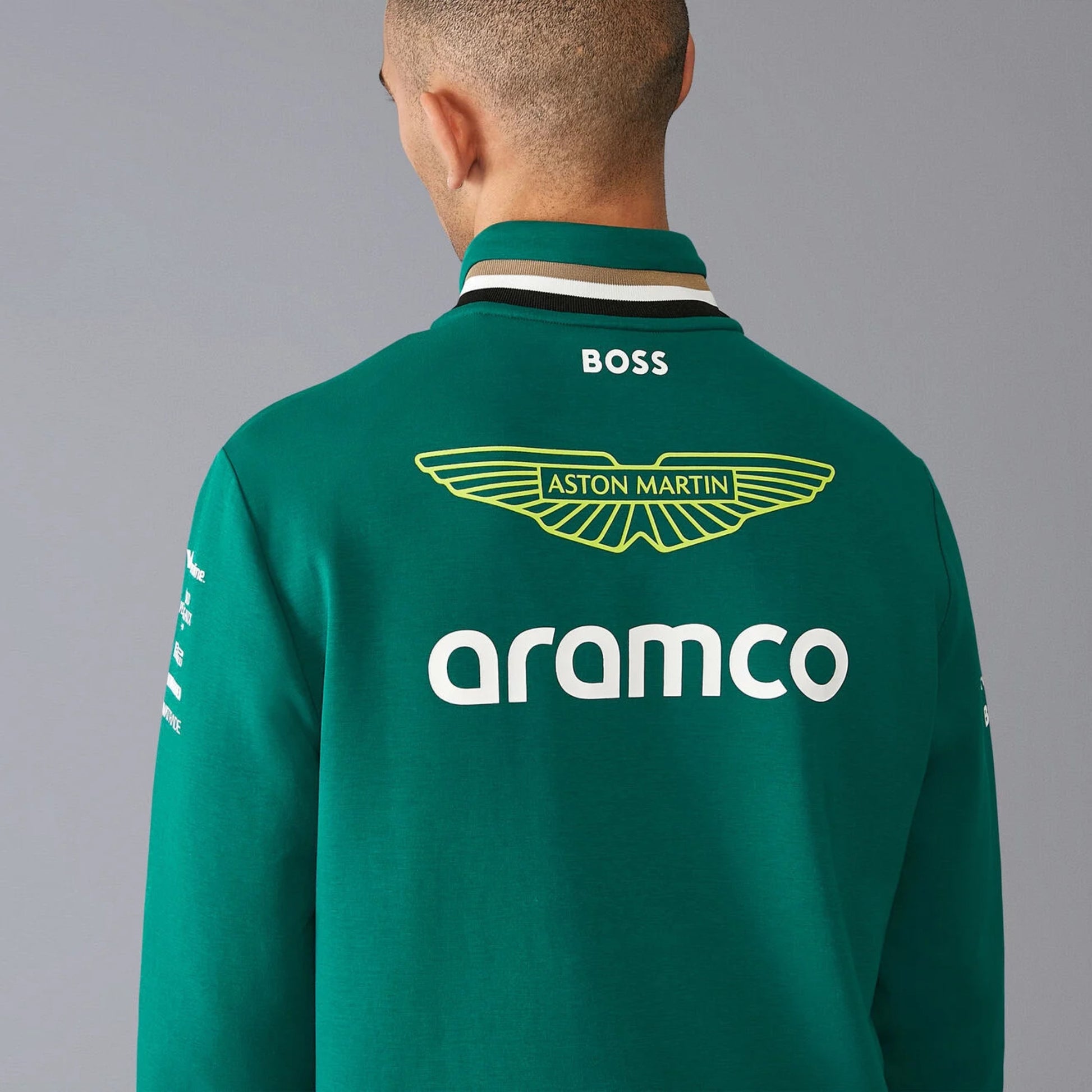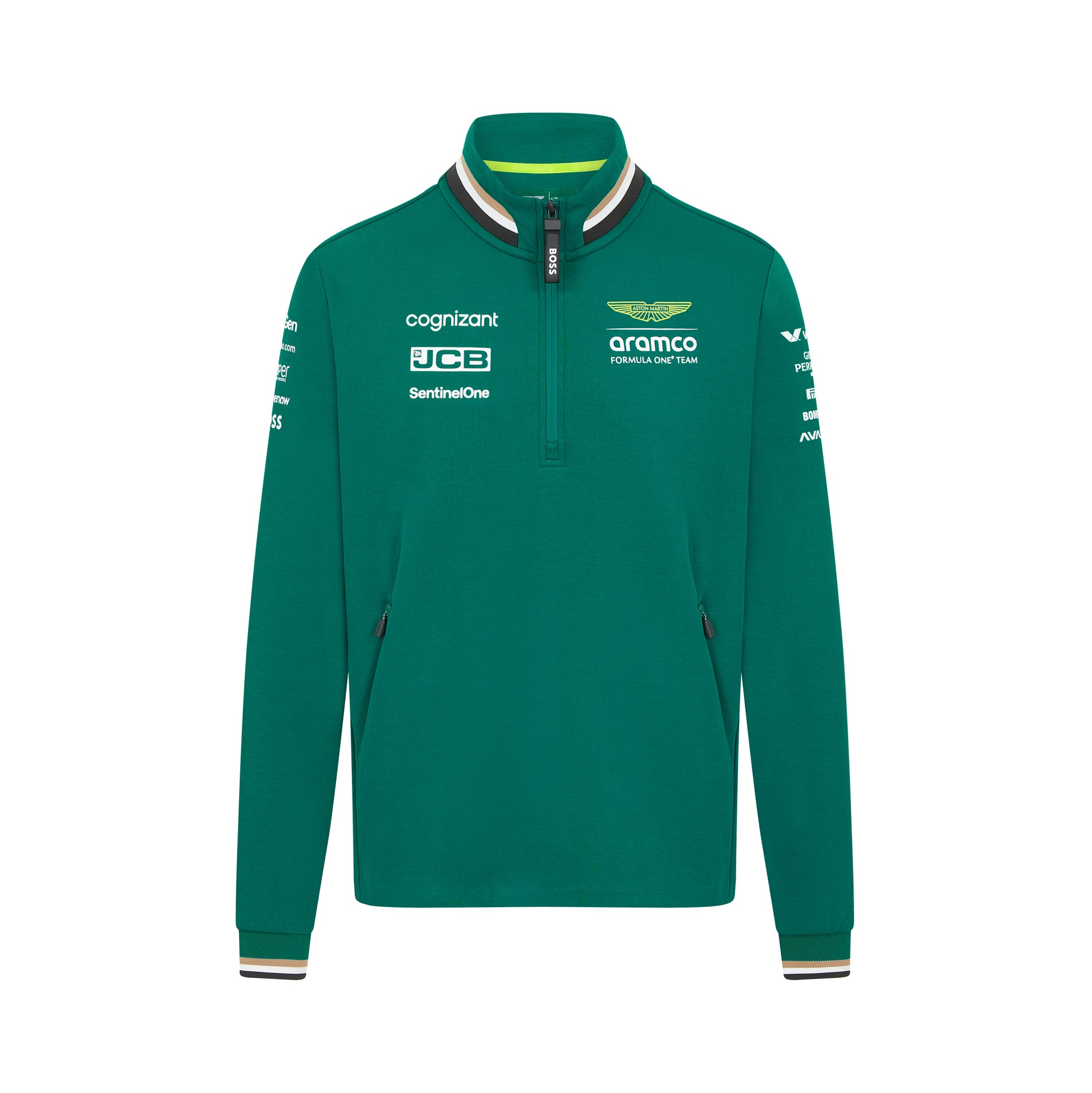 One of our favourites. The Aston Martin Quarter Zip can be worn smart or casual. Made from an Organic Cotton, Polyester and Elastine mix, its comfortable all day long. Boss striping on the collar and Cuffs compliments the Aston Martin F1 Team and Partner Logos. Concealed zip pockets are a useful addition. BOSS branded zip pullers gives this a very premium feel. Perfect quarter zip for Alonso, Stroll and Aston Martin fans
