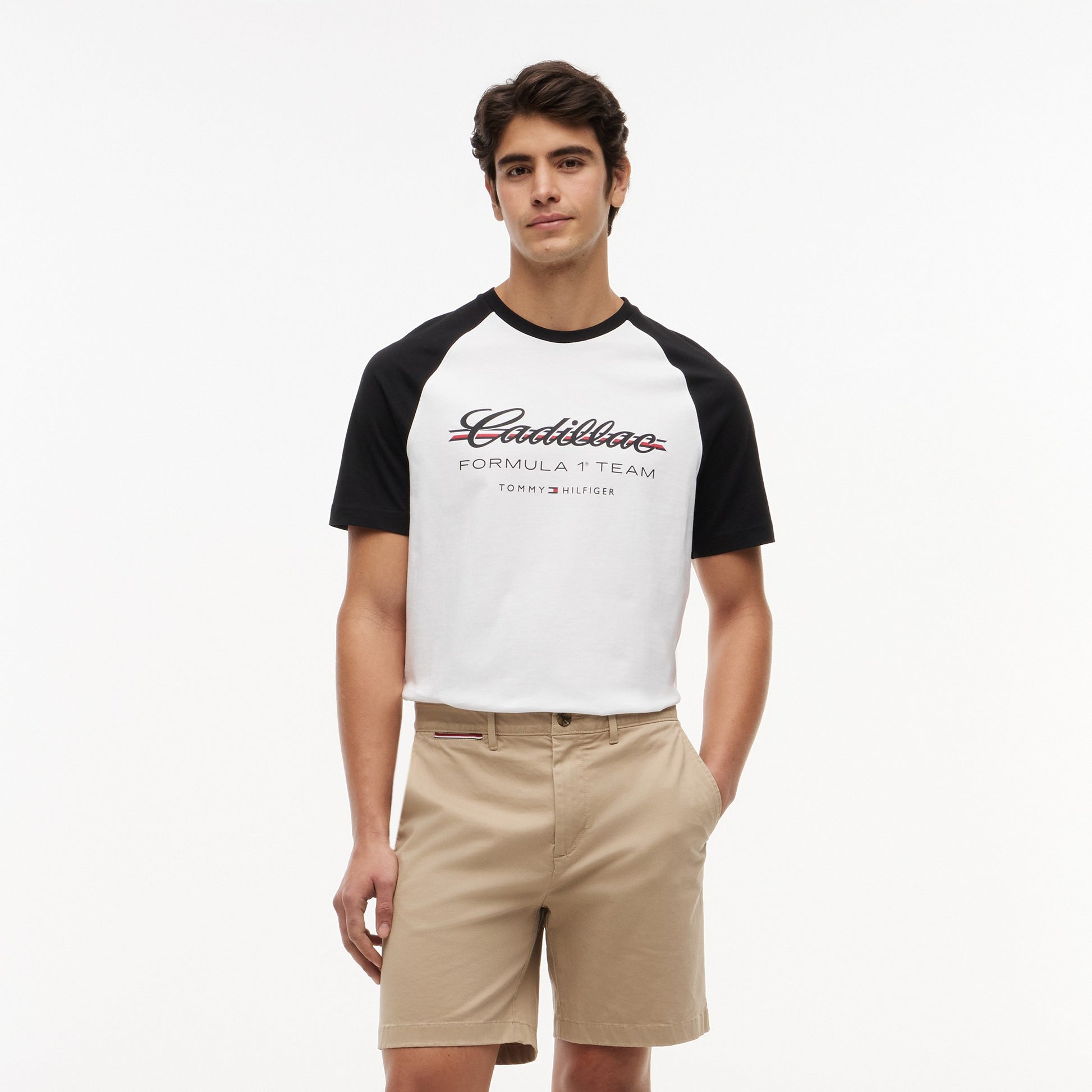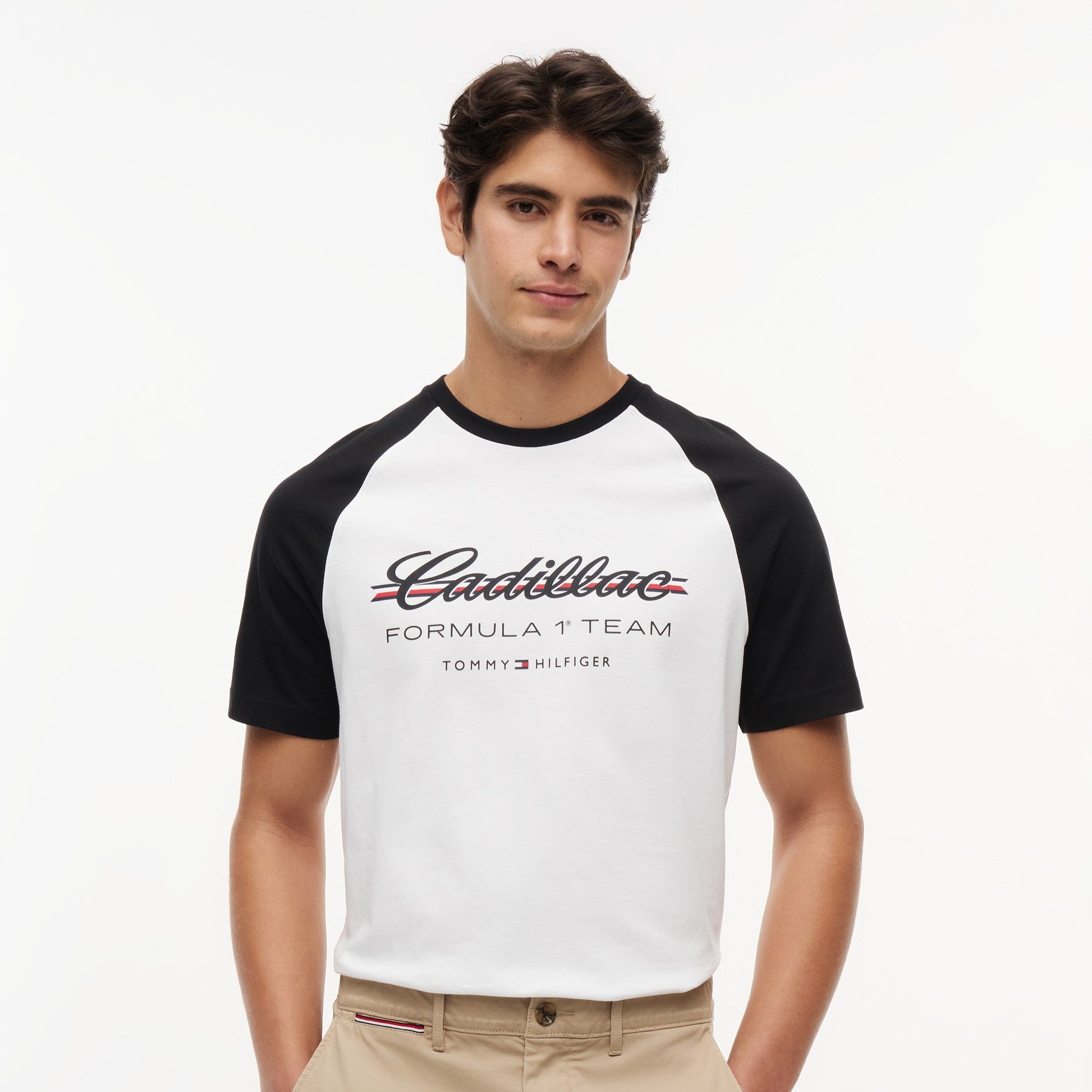 Show your American motorsport allegiance with the Cadillac F1 x Tommy Hilfiger Ringer Tee for Men in classic white with black trim. This premium men’s T‑shirt blends retro ringer style with bold Tommy Hilfiger x Cadillac Formula 1 Team branding for a standout, sporty look.