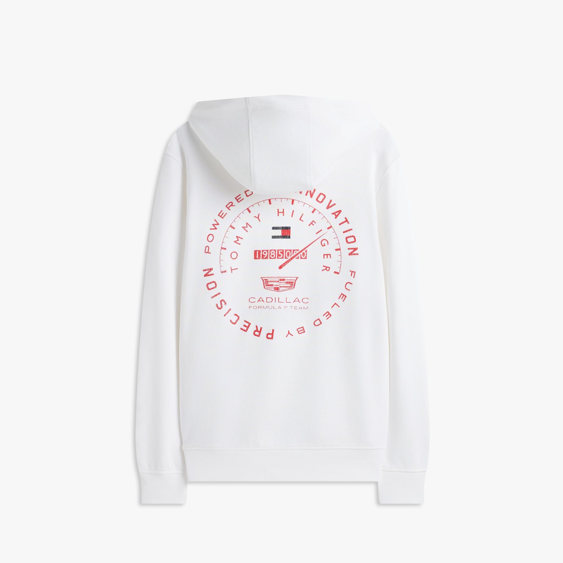 Capture the thrill of the race with the Cadillac F1 x Tommy Hilfiger Speedometer Hoodie for Men in crisp white. This premium men’s hoodie blends American motorsport-inspired design with Tommy Hilfiger’s signature quality.