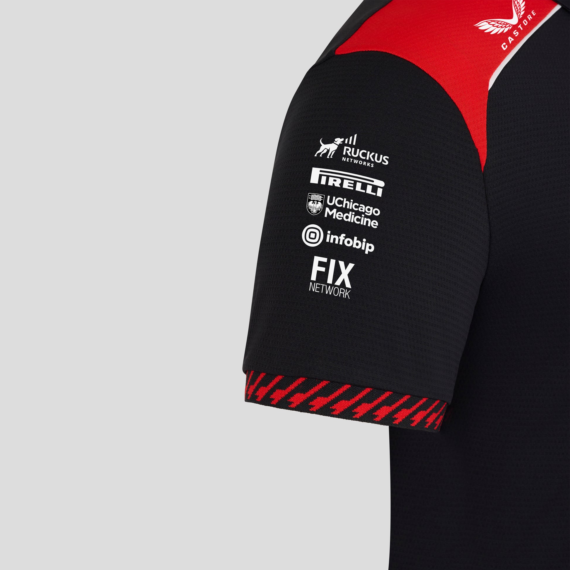 The Haas F1 F1 Team 2026 Short Sleeve Polo Mens - Caviar / Flame Scarlet combines smart, contemporary style with official Formula 1 team branding.