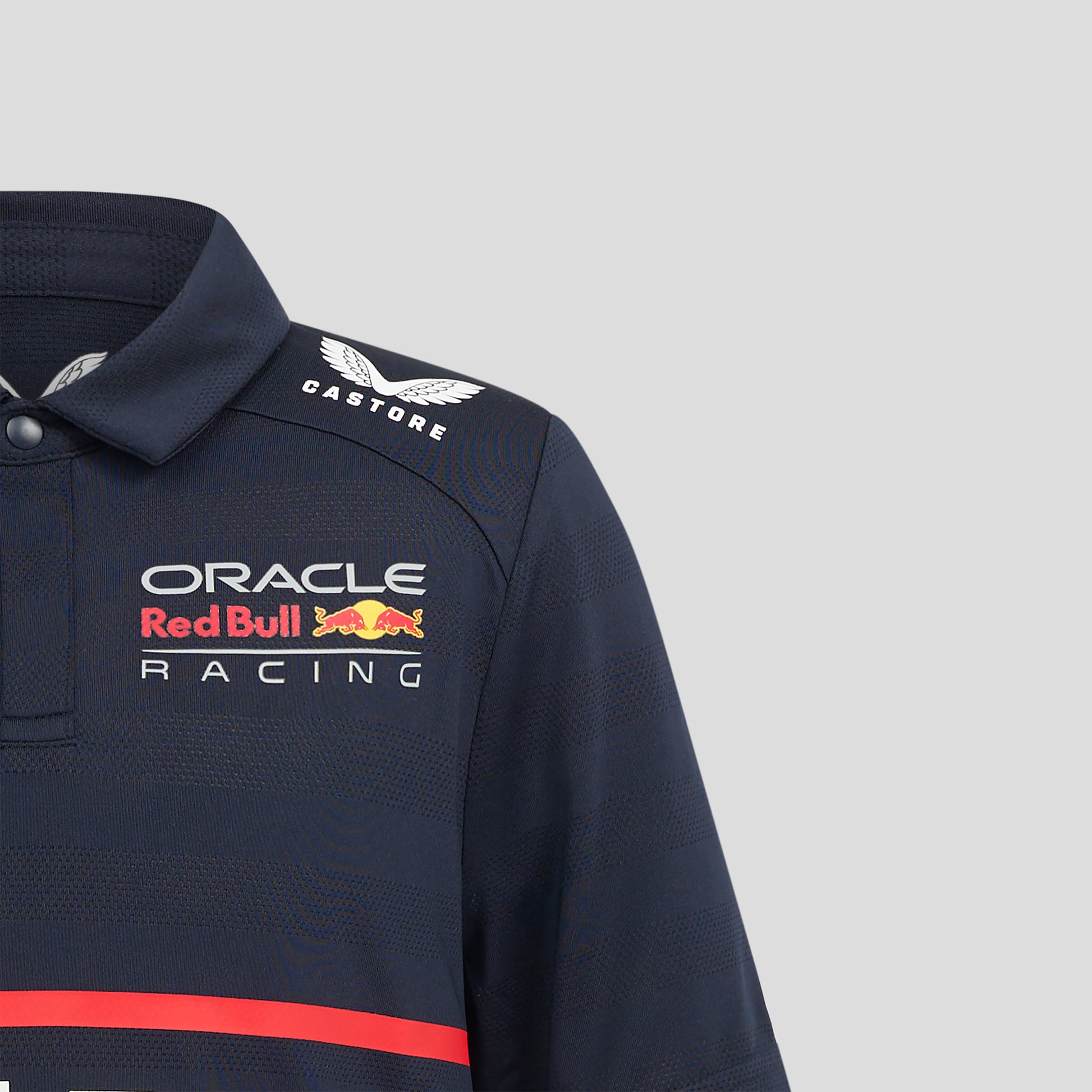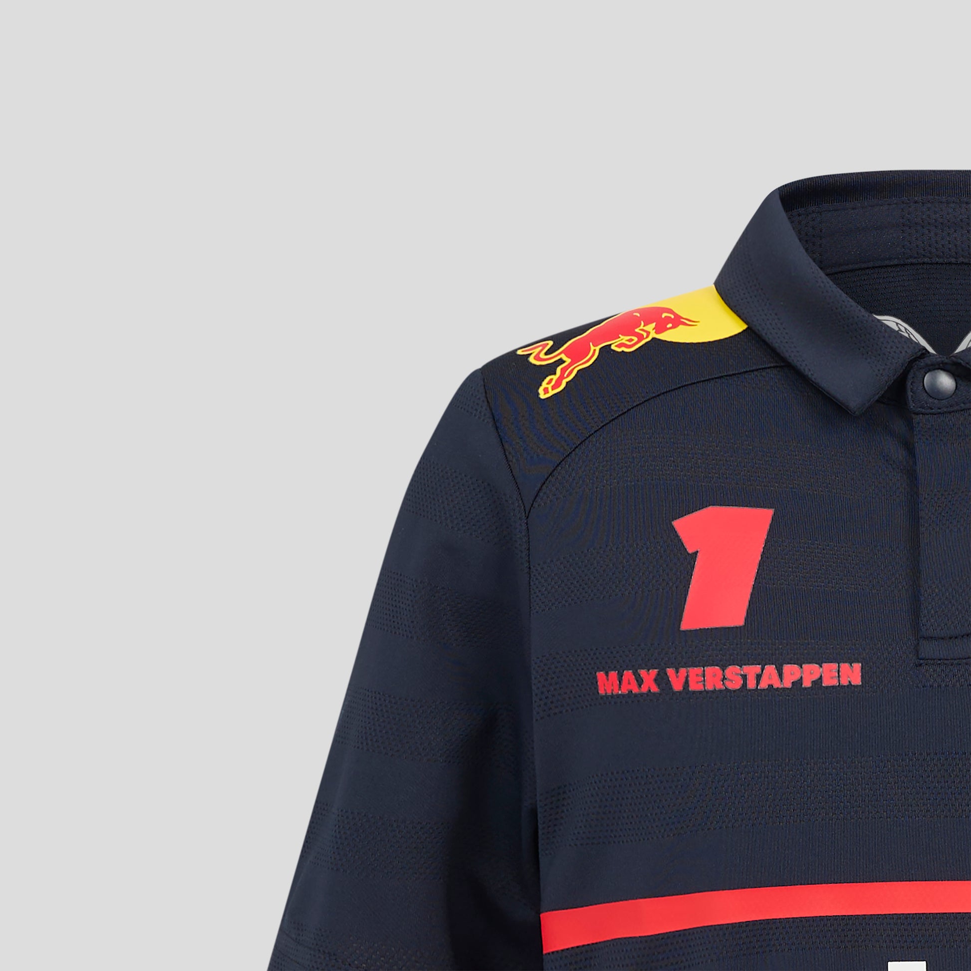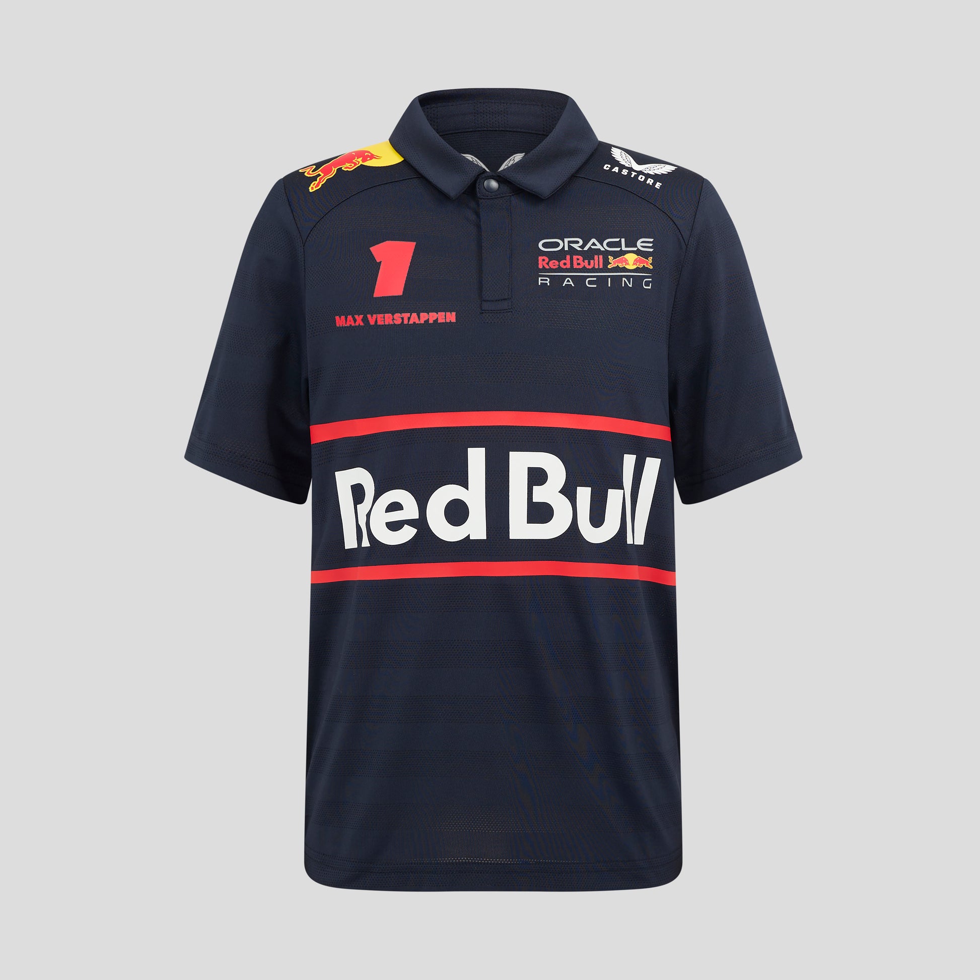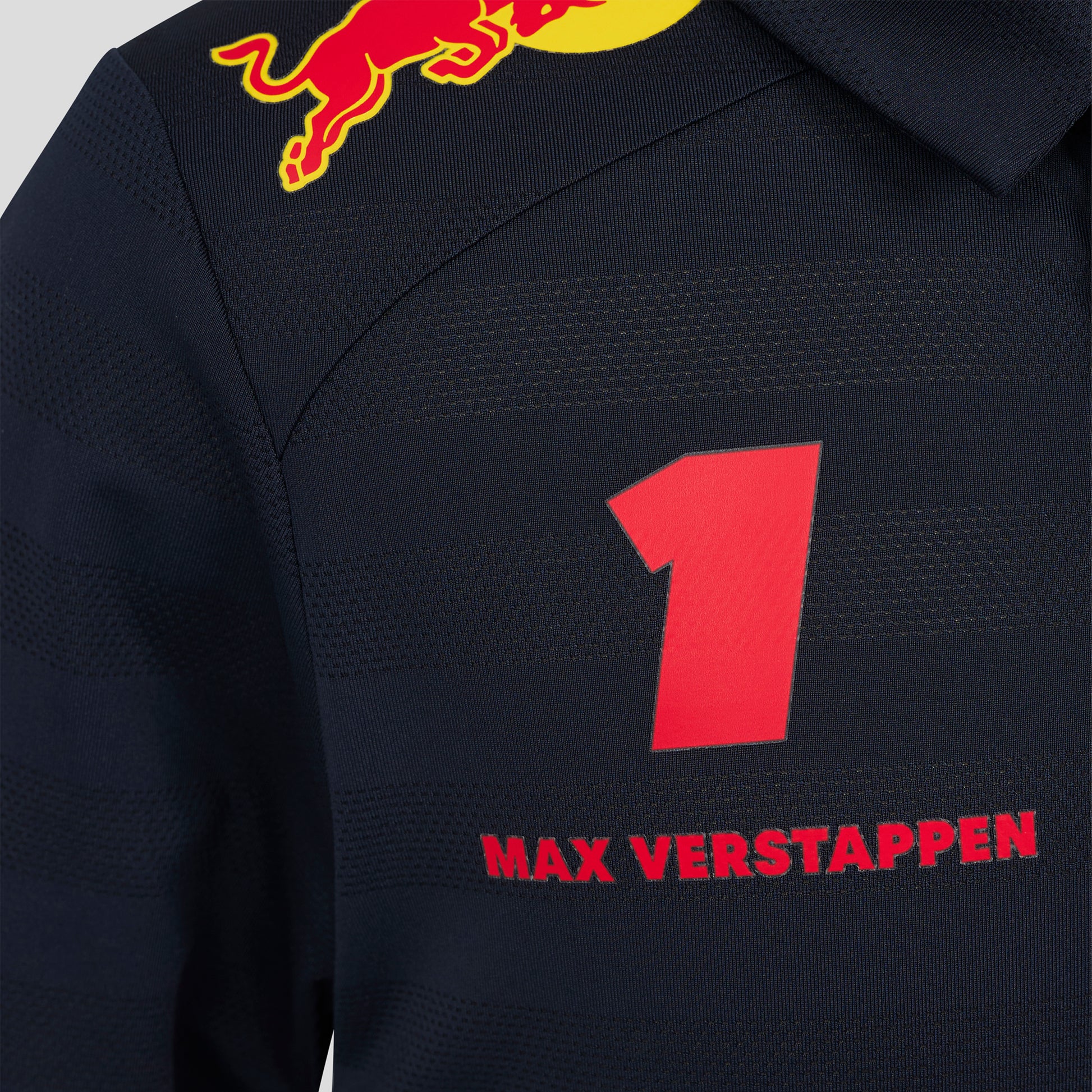 Oracle Red Bull MV F1 Kids Driver Racing Polo Shirt. Childrens polo shirt featuring Max Verstappens Formula 1 racer number "1". The back features the iconic charging Bulls logo.