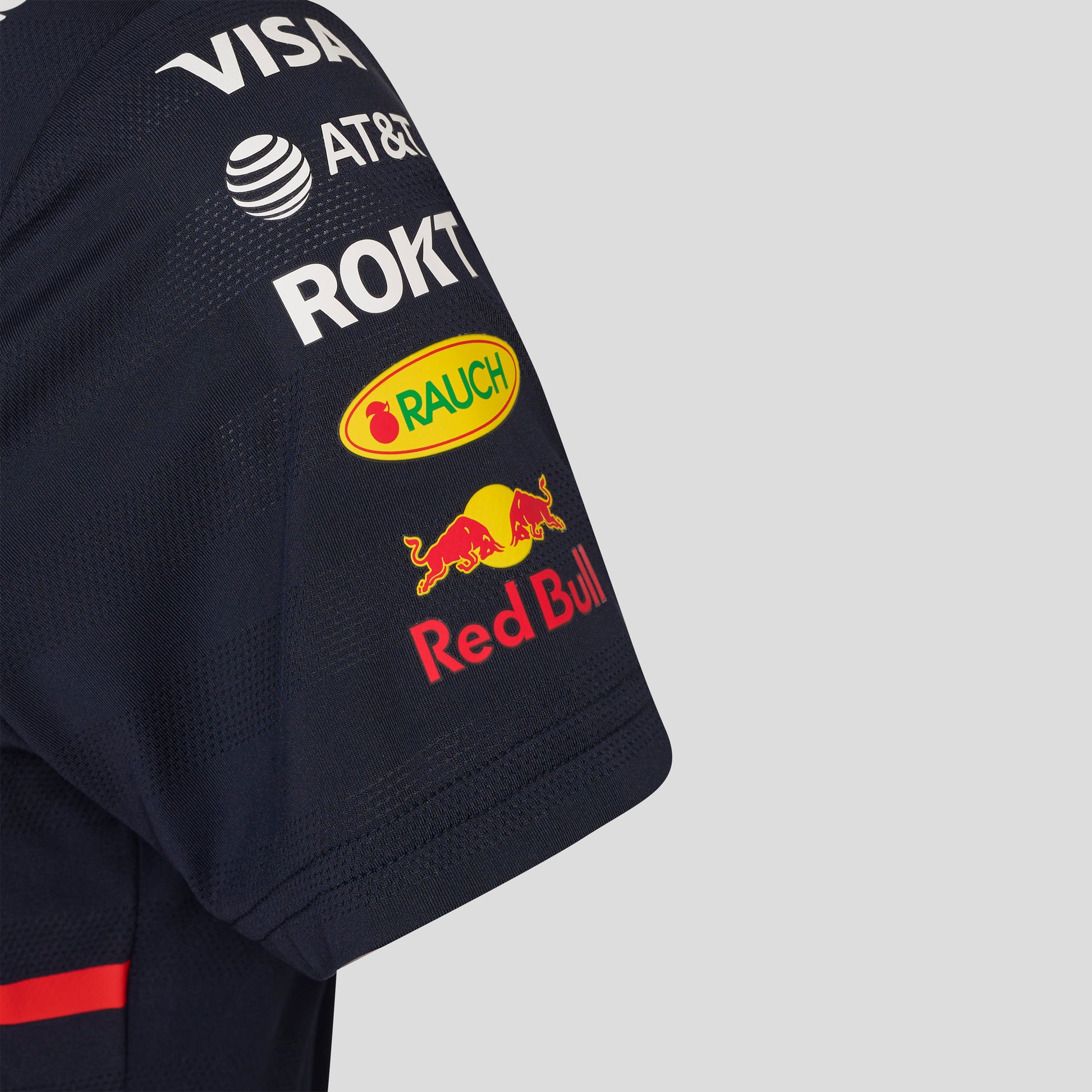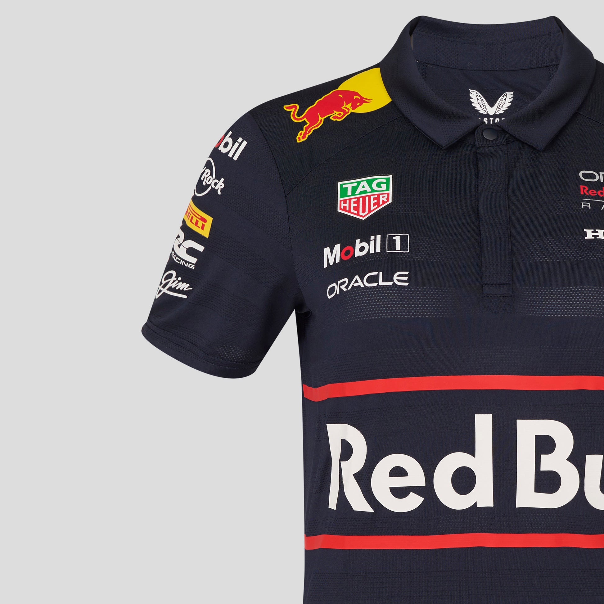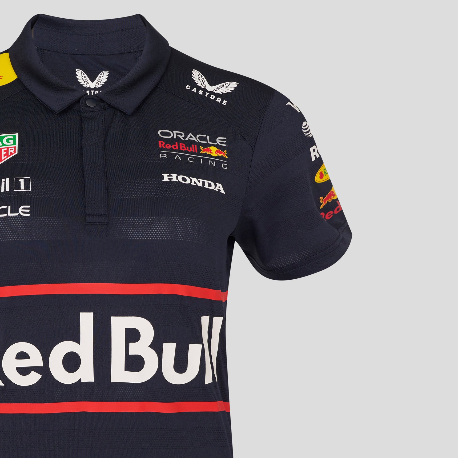 Oracle Red Bull Replica SS Polo Shirt. Womens Polo Shirt the front features the Red Bull team banner, ORBR team Logo and Tag Heuer official sponsor badge. The back of the polo shirt features the iconic charging Bulls logo.