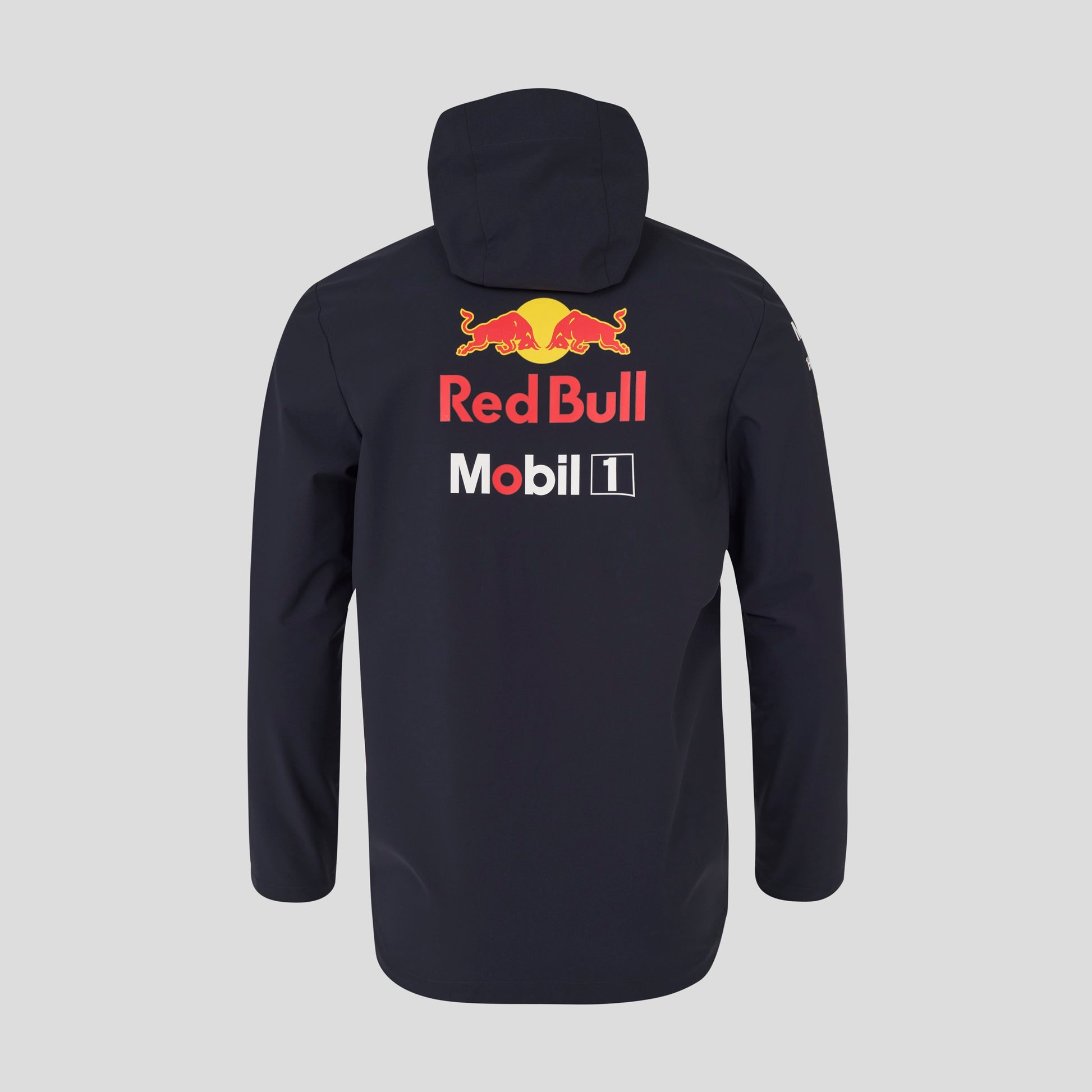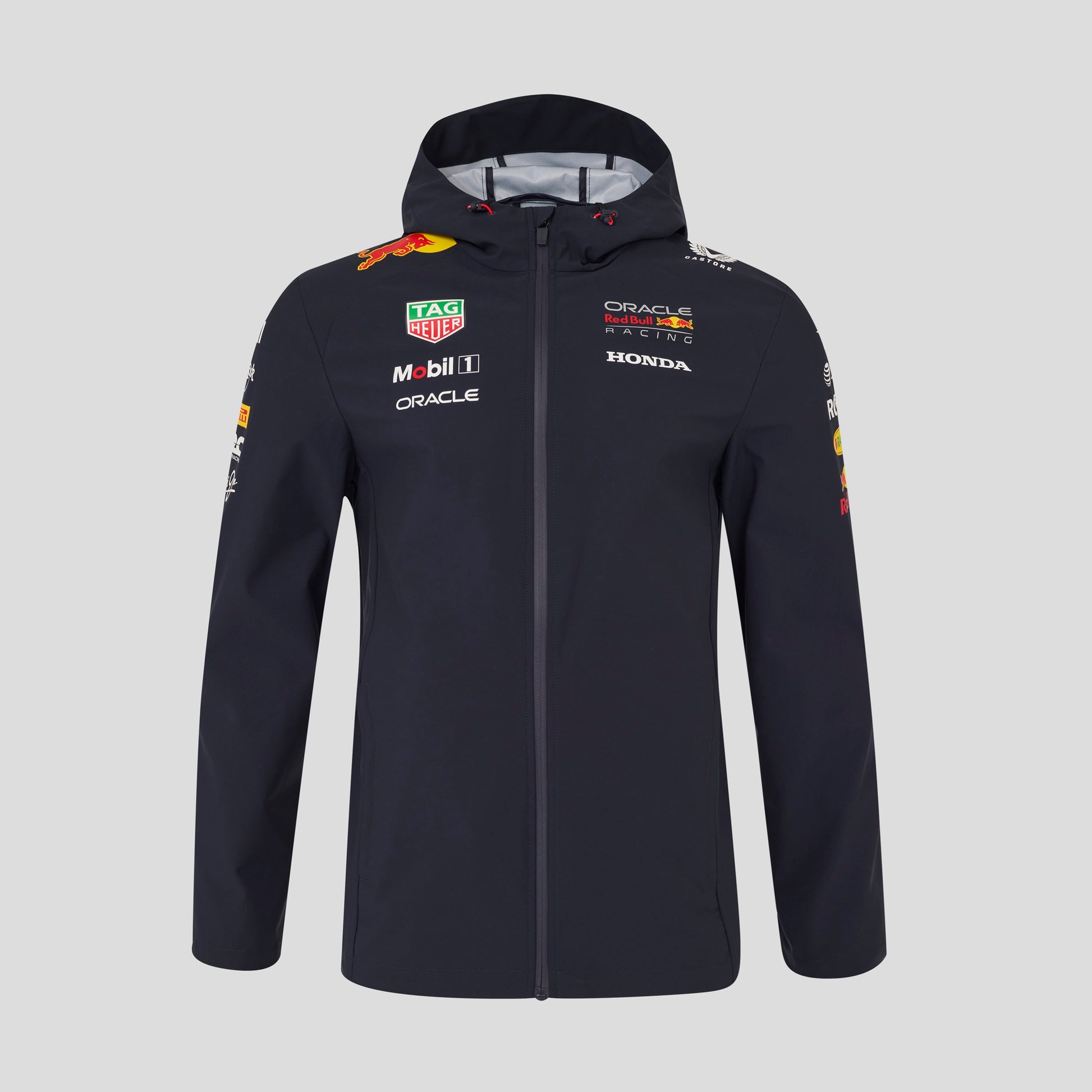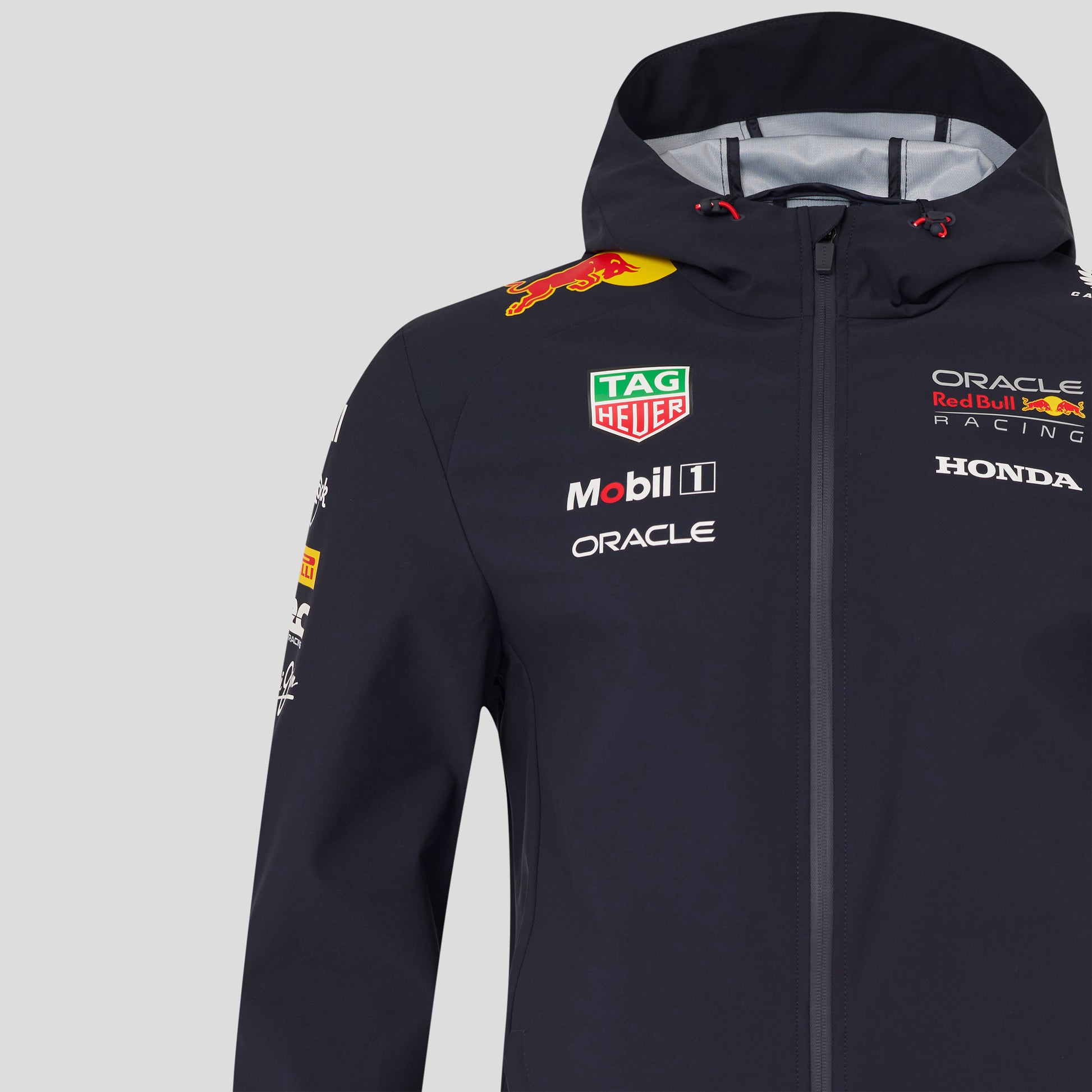 Adults Oracle Red Bull Racing F1 Water Resistant Jacket. Unisex hooded water resistant jacket featuring the ORBR team Logo and team sponsors. The back of the jacket features the iconic charging Bulls logo. In Night Sky