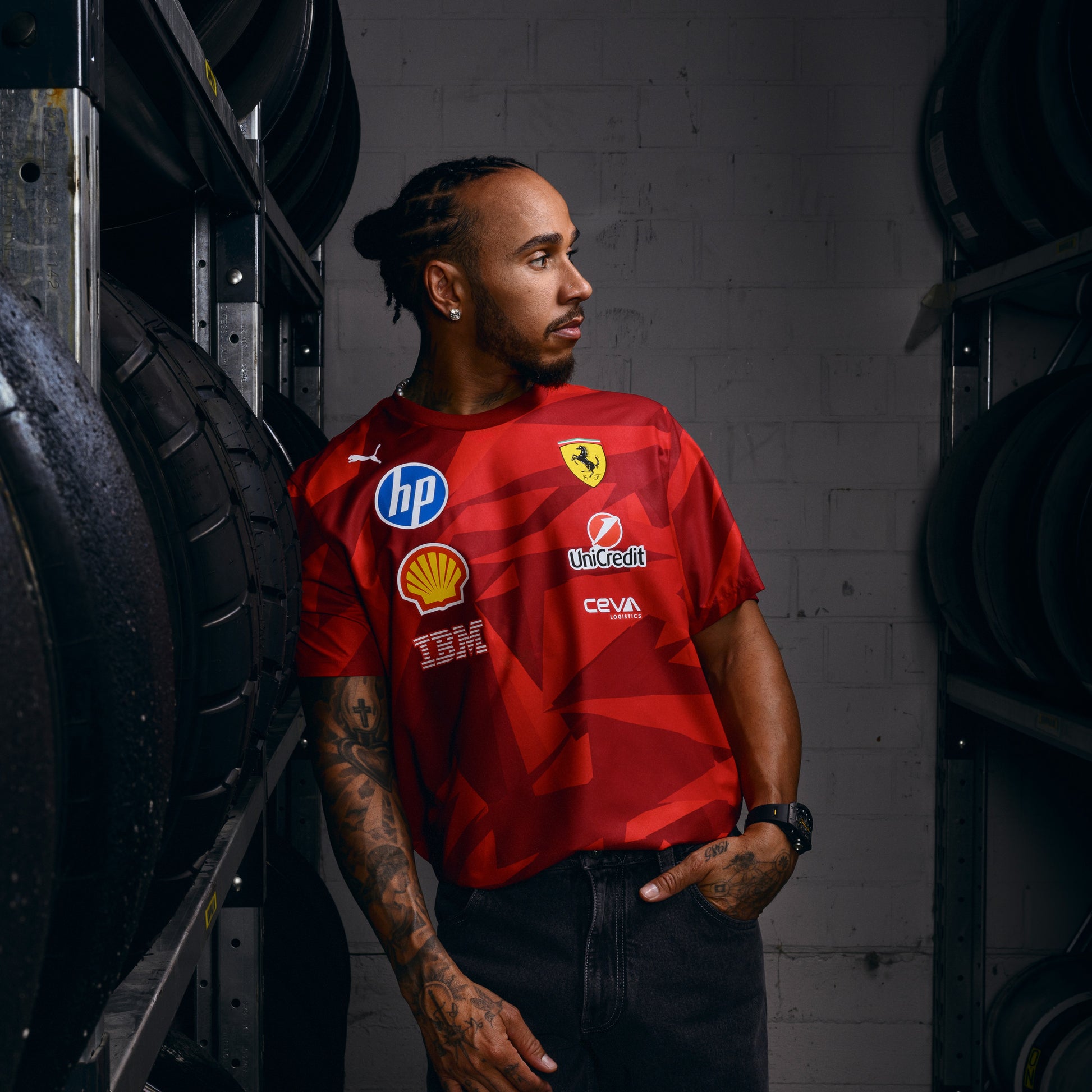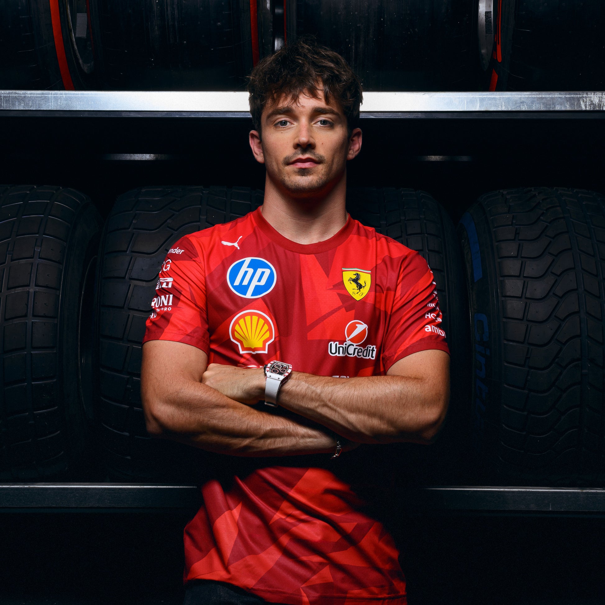Special edition PUMA Scuderia Ferrari Team T-shirt, launched to coincide with the 2025 Las Vegas Grand Prix. As worn by Lewis and Charles across the Formula 1 race weekend, in a special one-off design with all the official Ferrari and PUMA branding.