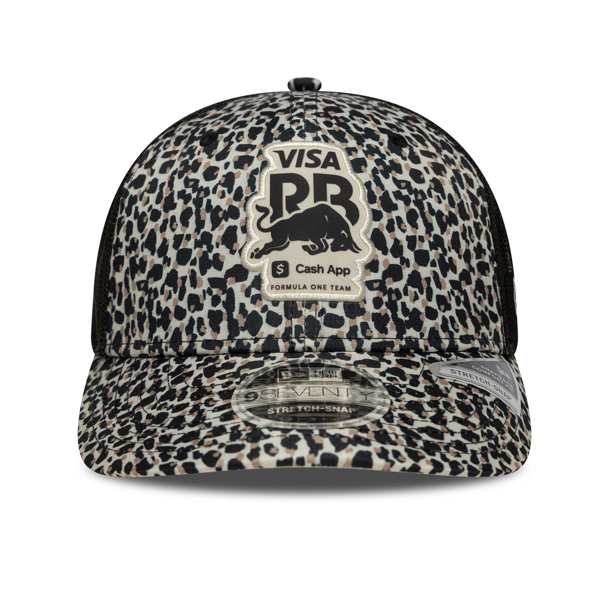 The Visa Cash App RB F1 Leopard 9Seventy Stretch Snap Cap – Stone combines bold Red Bull Racing style with a standout leopard-print design.